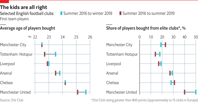 Тотнъм приложи подобна стратегия и тя му позволи да се бори над своята финансова категория, включително неочакван поход до финала в ШЛ тази пролет. Ман Юнайтед, Арсенал и Челси обаче бяха разточителни и вземаха утвърдени звезди, наближаващи залеза на своята кариера. Според 21st Club, между лятото на 2016 г. и края на миналия сезон тези три клуба са купили над 25% от своите играчи от 15-те най-високо класирани в европейската ранглиста отбори срещу по-малко от 20% при Сити, Ливърпул и Тотнъм (вижте чарта горе). Много от тях се оказаха скъпи провали, например Алексис Санчес, Радамел Фалкао и Хенрих Мхитарян. Колкото повече се сриваха резултатите на терена на тези три тима, толкова повече нарастваше изкушението у тях да се купи готово и бързо решение от континенталните грандове като Реал Мадрид или Байерн (Мюнхен).
