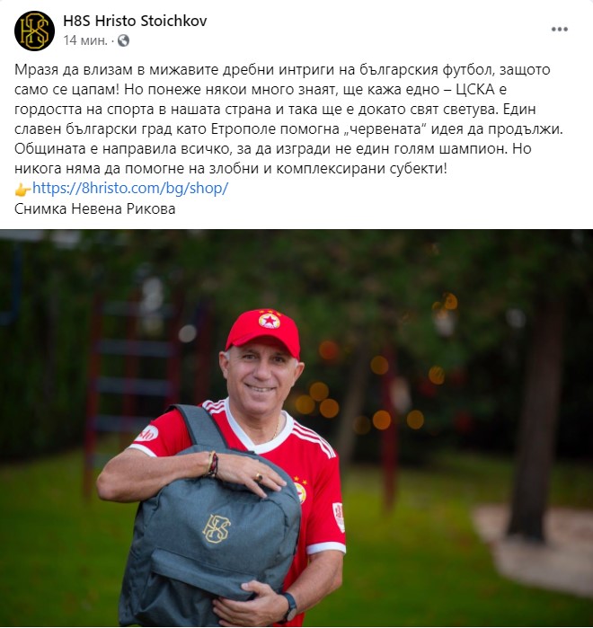Стоичков използва Фейсбук, за да отговори индиректно на бившия национал: „Мразя да влизам в мижавите дребни интриги на българския футбол, защото само се цапам! Но понеже някои много знаят, ще кажа едно – ЦСКА е гордостта на спорта в нашата страна и така ще е докато свят светува. Един славен български град като Етрополе помогна „червената“ идея да продължи.